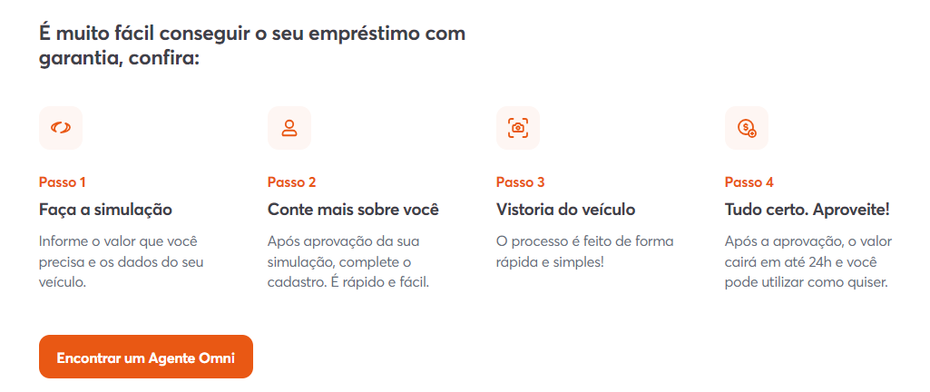 Com o empréstimo Omni, você pode utilizar seu carro ou moto como garantia e conseguir até 70% do valor do seu veículo. Além disso, tem um prazo de até 48 meses para quitar o pagamento.