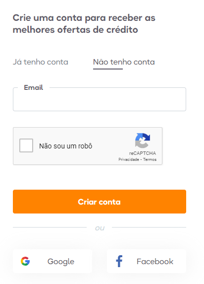 - Clique em “Não tenho uma conta”, informe seu e-mail e clique em “Criar conta”, ou faça login com Google ou Facebook.