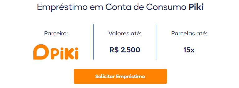 Com o empréstimo Piki, as parcelas são descontadas diretamente de uma de suas contas de consumo. O prazo para quitar o pagamento é de até 15 meses, e você pode solicitar até R$ 2.500.